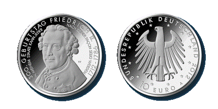 Münzzeichen: A, D, F, G, J (alle deutschen Prägestätten) Ausgabetermin: 25. Juni 2012* Das ist die dritte Münze der bis 2015 geplanten Serie. |